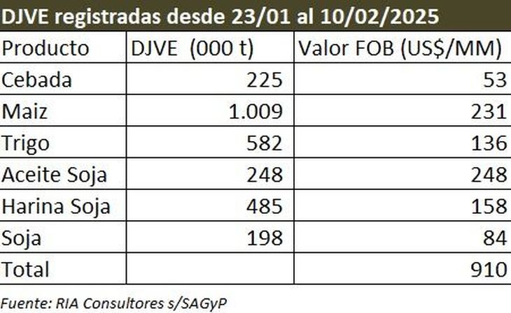 Javier Preciado Patiño, consultor y ex Subsecretario de Mercados Agrícolas aseguró a Ámbito que “desde que se puso en marcha la baja de las retenciones (23/1/2025) hasta el día de hoy el producto más registrado fue el maíz con un volumen de 1.009.000 toneladas y un valor FOB cercano a los US$ 231 millones. La harina de soja sumó 485.000 por otros S$ 159 millones. El trigo aparece en tercer lugar con 582.000 toneladas sumando US$ 136 millones y la cebada con 225.000 toneladas, otros S$ 53 millones de toneladas. De aceite de soja se registraron para exportar 248.000 toneladas por valor de unos S$ 248 millones”.